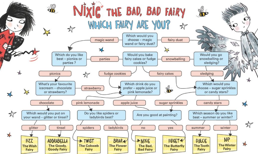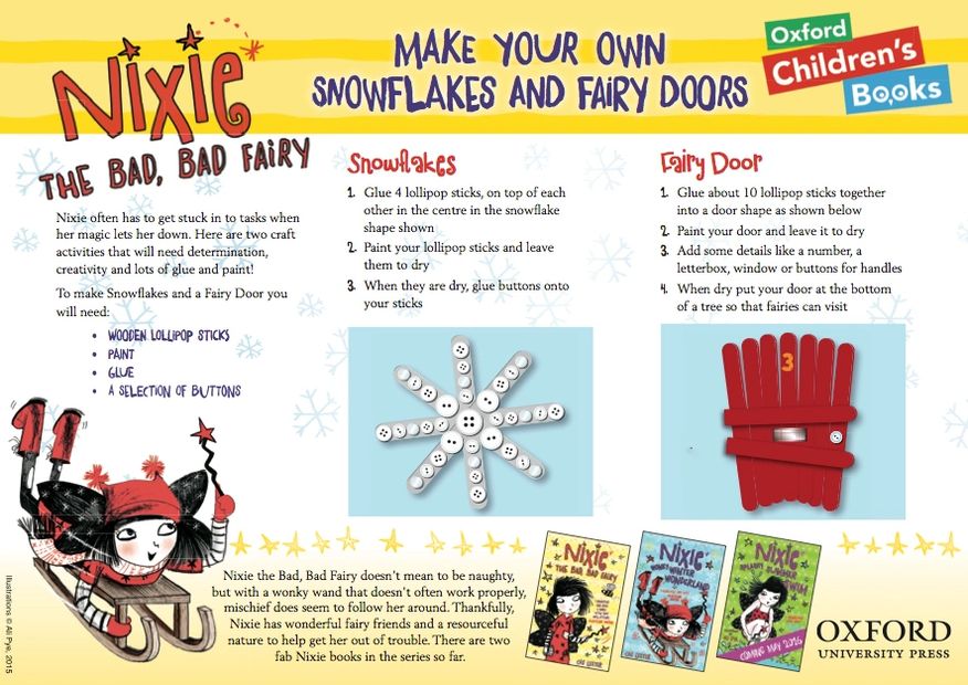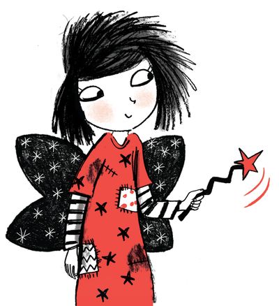 Nixie's boots and dress are red and her wings are black. But you can use any colours you like!